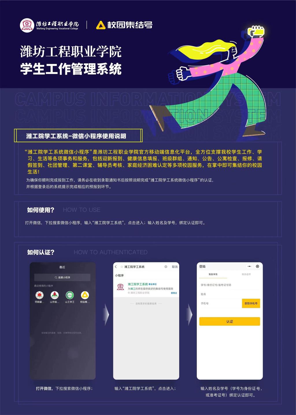 (1)学生在8月20日后,正式报到前,使用微信小程序“潍工院学工系统”进行预报到。
